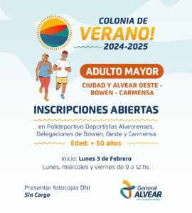 La Dirección de Deportes de General Alvear, a cargo del Prof. Alberto Gómez, anunció la apertura de inscripciones para la Colonia de Verano 2025 destinada a adultos mayores. La propuesta, que ya es un